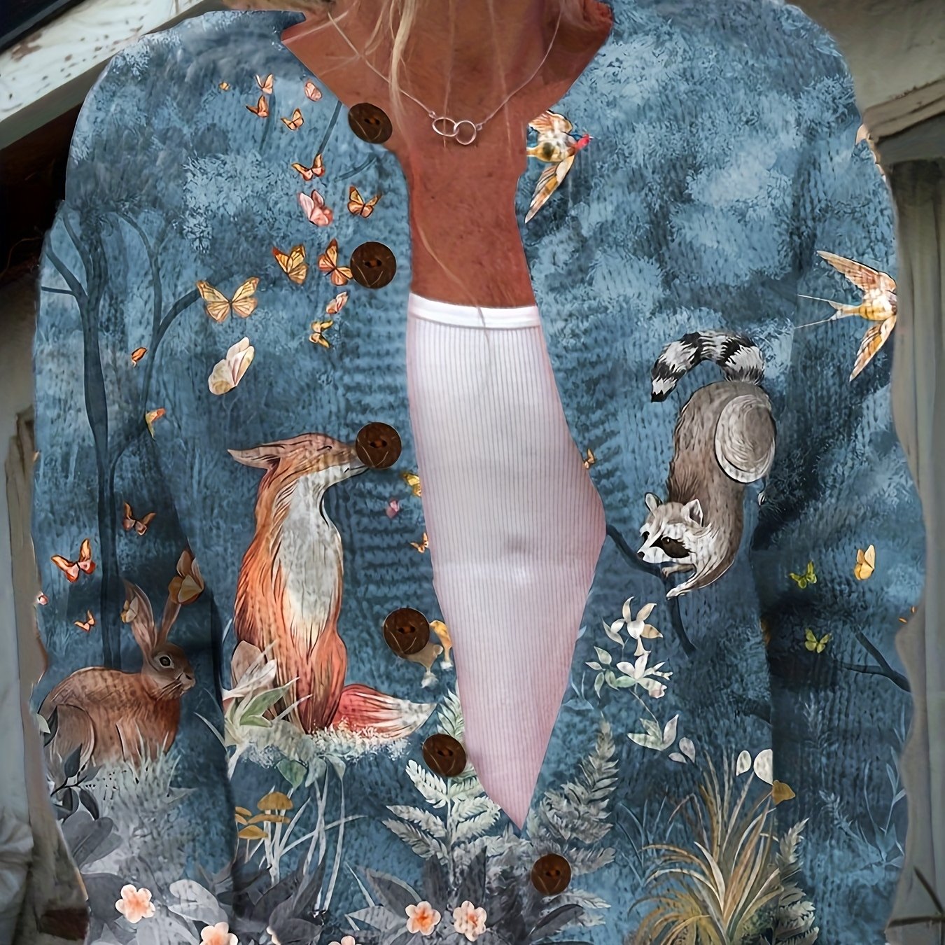 Plus Size - Large Size Women'S Button Sweater | Fashion Button Front Lapel, Plant Art Pattern, All-Season Light Casual Outing, Natural Inspiration Design, Soft Texture, V-Neck, Long Sleeve, Regular Fit
