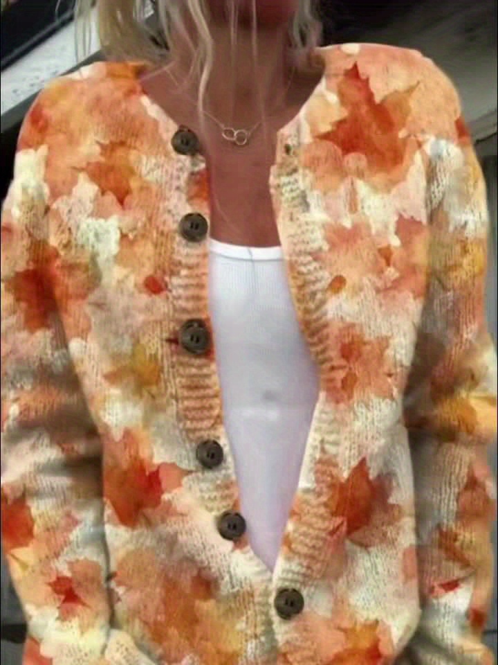 Plus Size - Plus Size, Women'S Plus Size Lightweight Floral Print Cardigan - Vibrant Orange & Yellow All-Over Flower Pattern, Elegant Round Neck Long Sleeve Sweater Coat, Non-Stretch Fabric Fall Winter Outerwear for Casual to Formal Wear