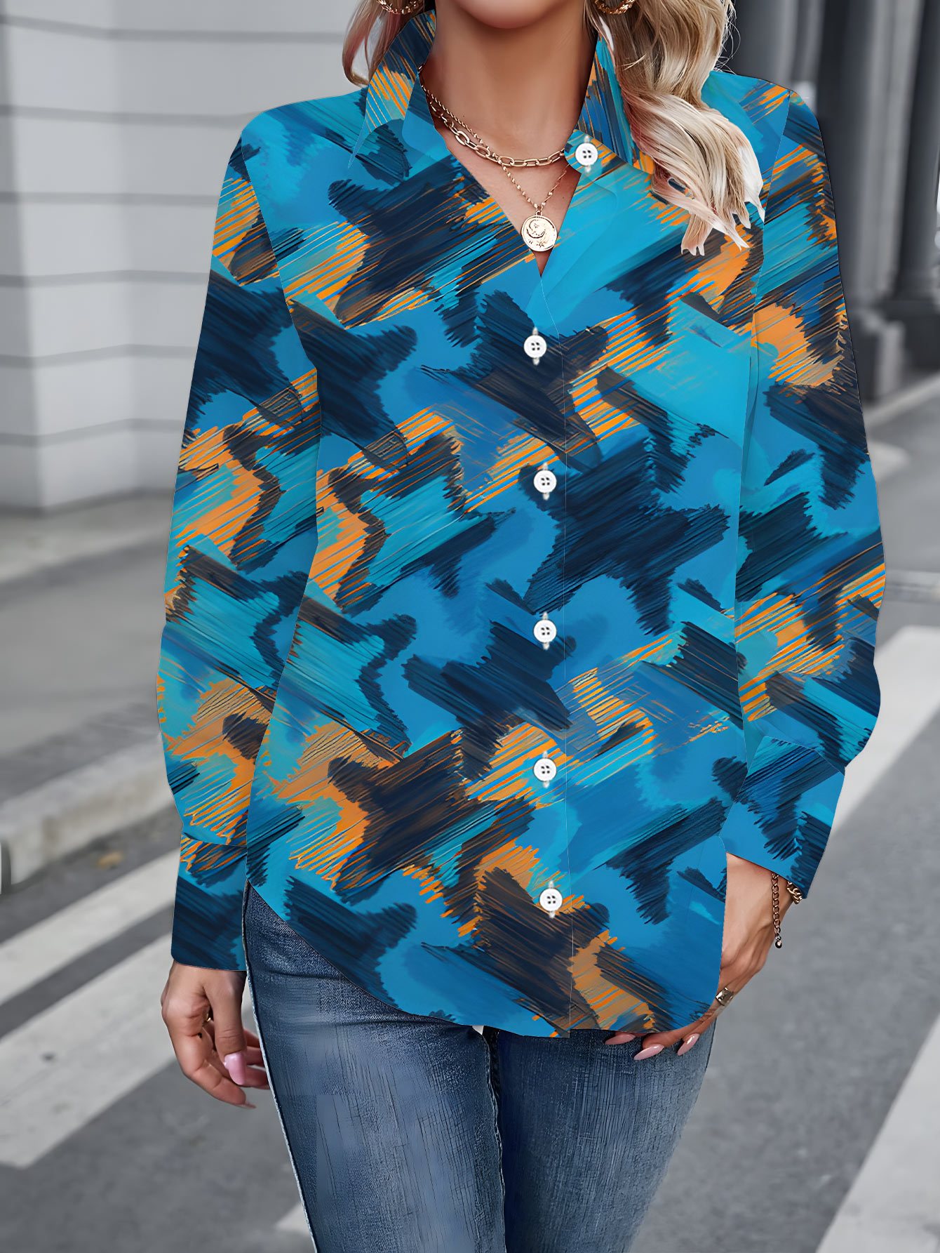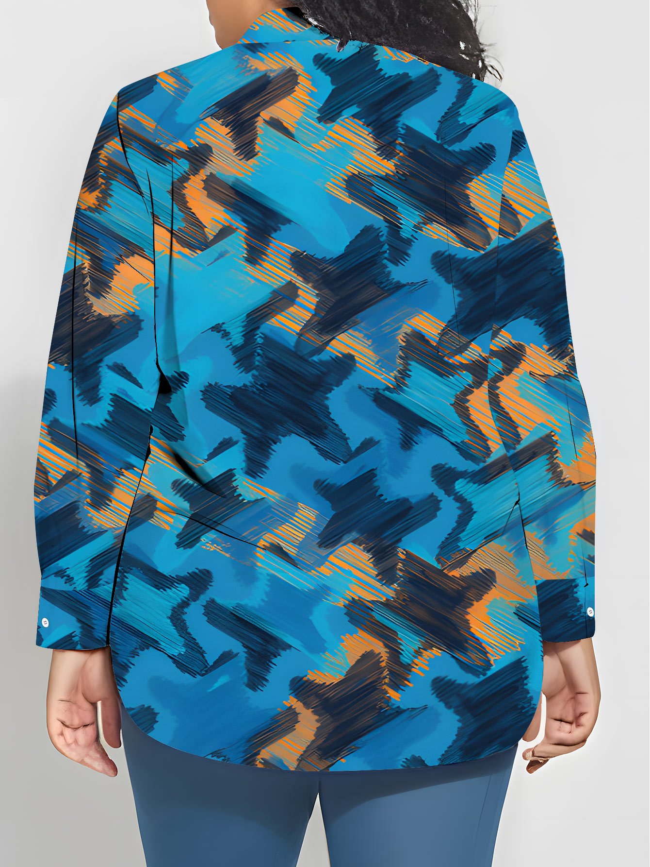 Plus Size Women'S Casual Long Sleeve Button-Up Shirt | Vibrant Abstract Print, Lightweight Stretchy Fabric, Perfect for Spring & Fall, Versatile for Casual Attire