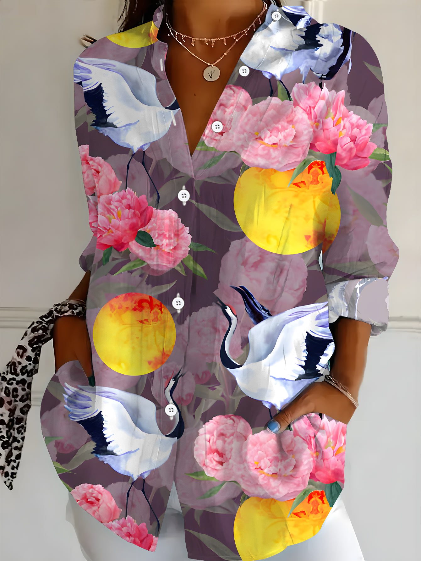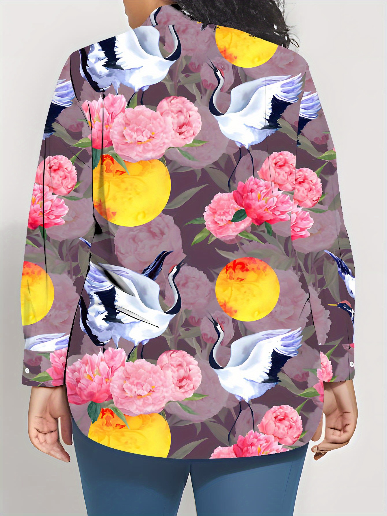 Plus Size Women'S Long Sleeve Shirt with Crane and Floral Print | Retro Style Mid-Length Casual 3D Soft Comfortable Light Beige-Friendly Base Layer for SpringAutumn, Slight Stretch Fabric, Regular Sleeve Length