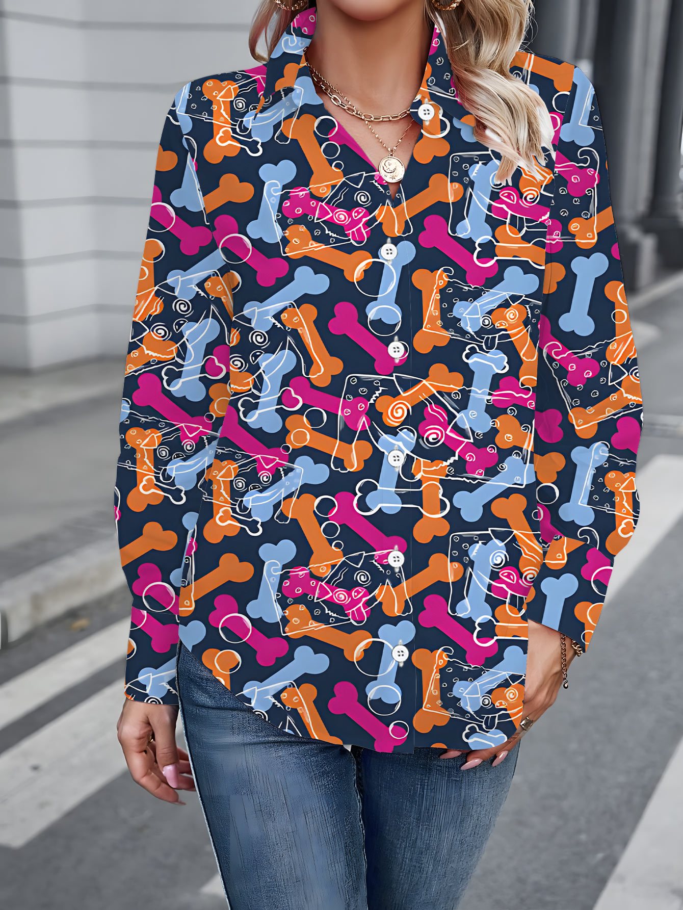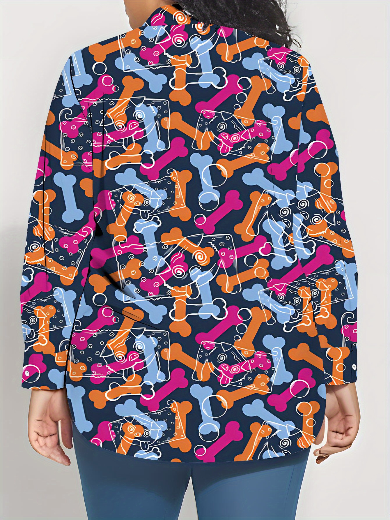 Plus Size Women'S Oversized Long Sleeve Shirt with 3D Bone & Paw Print | Soft Casual All-Season Blouse, Plush Pet Lover Outfit, Button Front Closure, Relaxed Fit, Hand Wash Dry Clean, Vibrant Colors, Longline Design, Soft Fabric for Layering