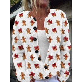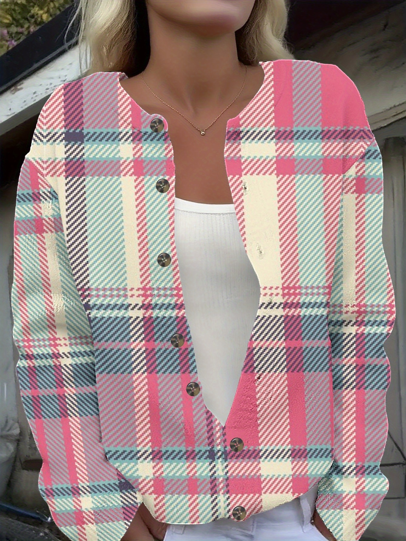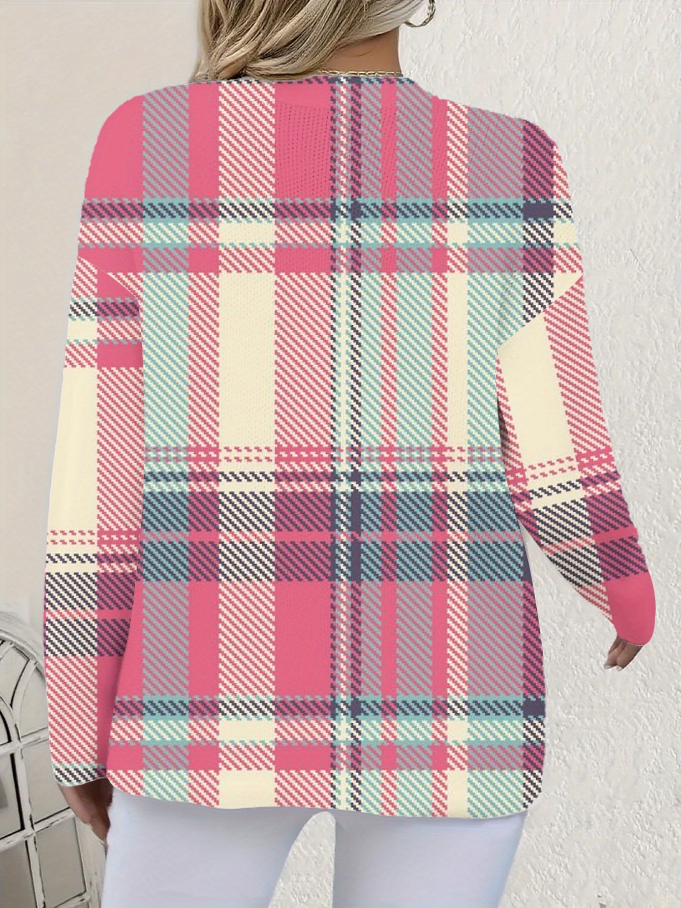 Plus Size Women's Soft Stretchy 3D Plaid Cardigan Sweater Jacket - Pink Button Front Round Neck Longline H-Line Coat with Umbrella Hem, All-Season Cozy Outerwear for Casual & Semi-Formal Wear, Machine Washable