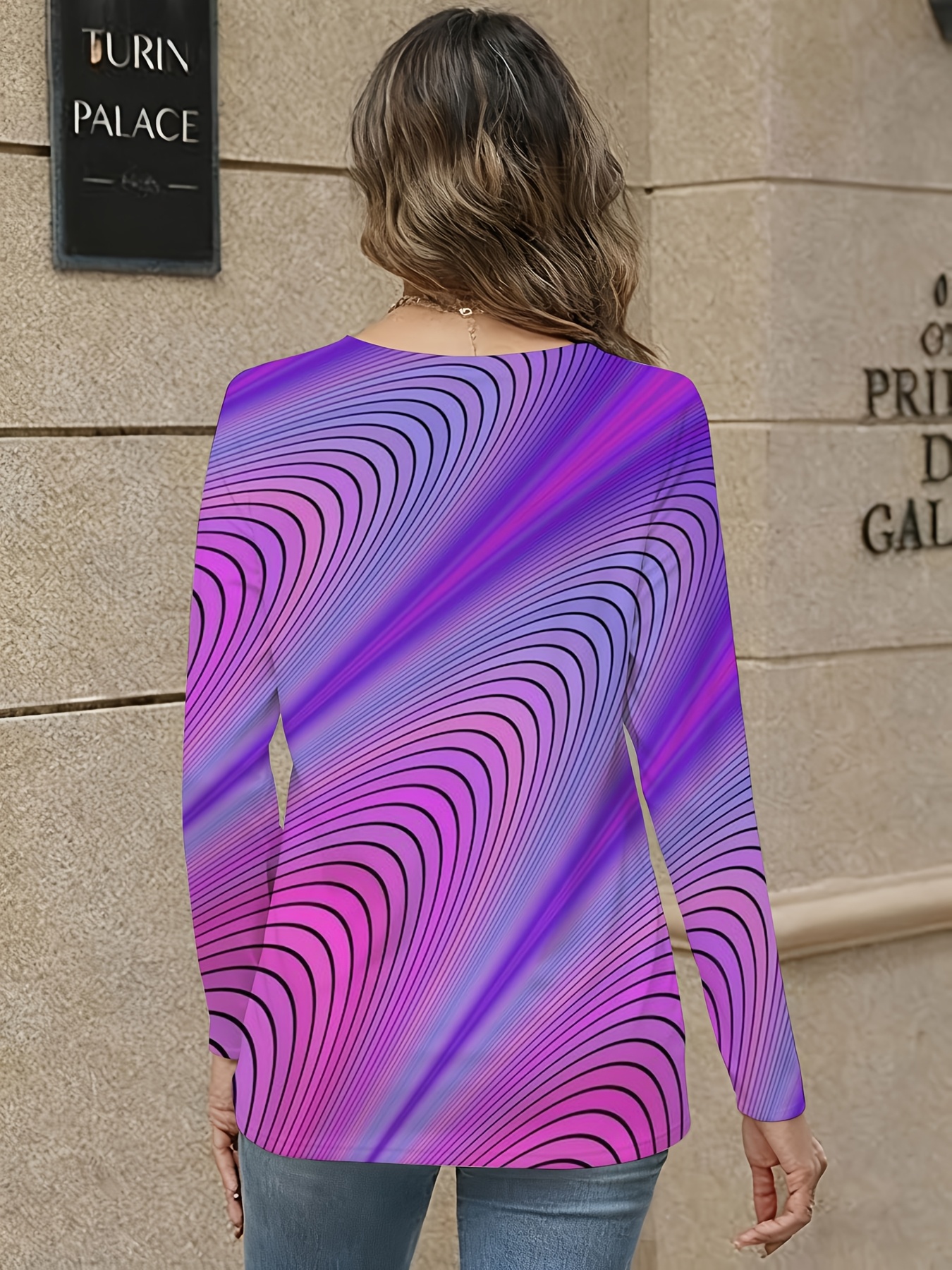 Plus Size Women'S V-Neck 3D Pink Purple Wave Pattern Long Sleeves T-Shirt | Abstract Print, Casual Style, Suitable for Winter, Christmas Party, Birthday, Christmas Enthusiasts, Christmas Limited Edition, New Year Gift