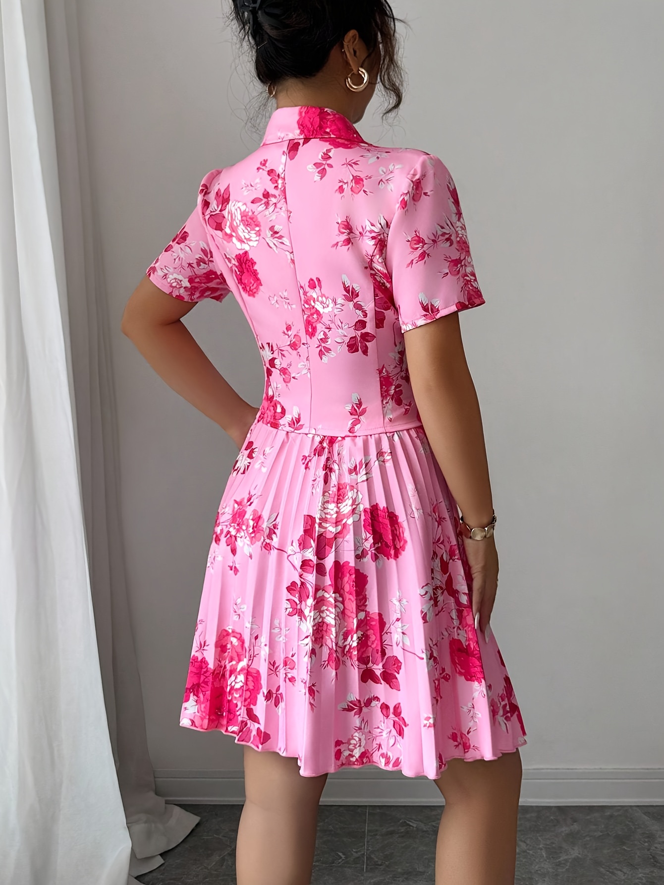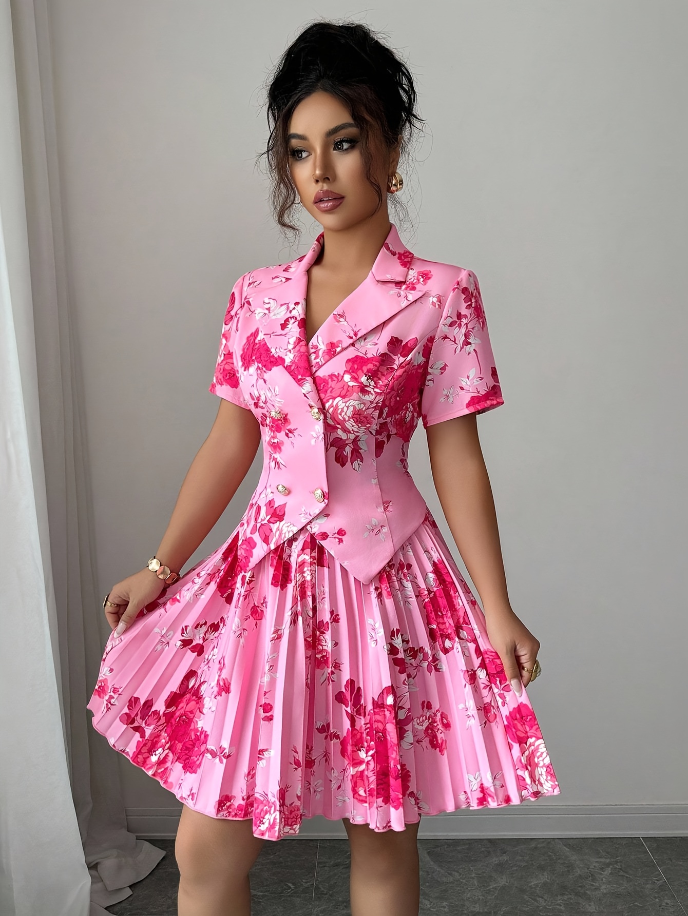 Printed Short Sleeve Pleated A-Line Elegant Romantic Women Suit Set