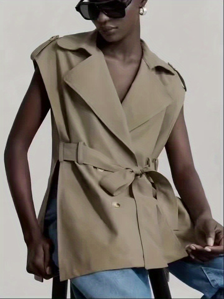 Women's Sleeveless Blazer Coat - Belted Lapel Collar H-Line Tailored Jacket, Beige/Brown/Black/Navy/Gray, Machine Washable All-Season Office Wedding Party Uniform, Structured Lapel Lapel Suit Outerwear