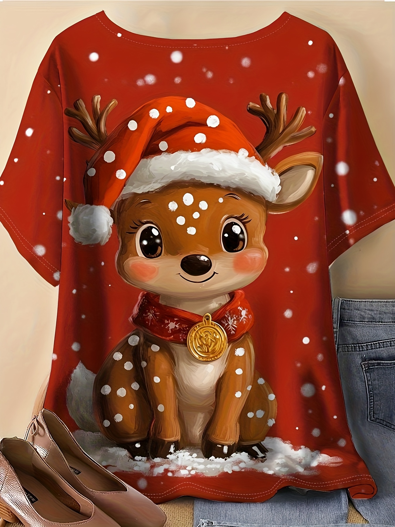A Plus-Size Women'S T-Shirt Featuring a Reindeer Print with a Christmas Hat - Breathable, Round-Neck, Short-Sleeve Summer Top, Machine Washable with Artistic Design, Made from Comfortable Fabric, Perfect for Casual Wear, a Must-Have for Summer Outfi