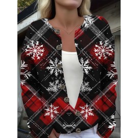 Women's Plus Size Red Black White Plaid Snowflake Cardigan - Faux Sweater Jacket with Golden-Tone Buttons, Winter Warm Coat for Christmas Parties, Layering Piece (Machine Washable) - All-Season Outerwear (Casual to Dressy)