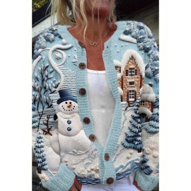 Plus Size Women's XL to 6XL Elegant Cardigan Sweater - Winter Snowman & Snow House Button-Front Closure, Lightweight Warm Long Sleeve Round Neck Coat, Casual Fall Winter Outfits Christmas New Year Gift