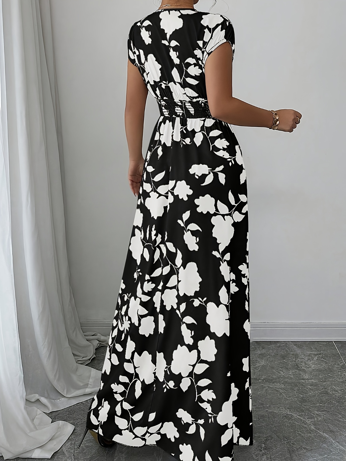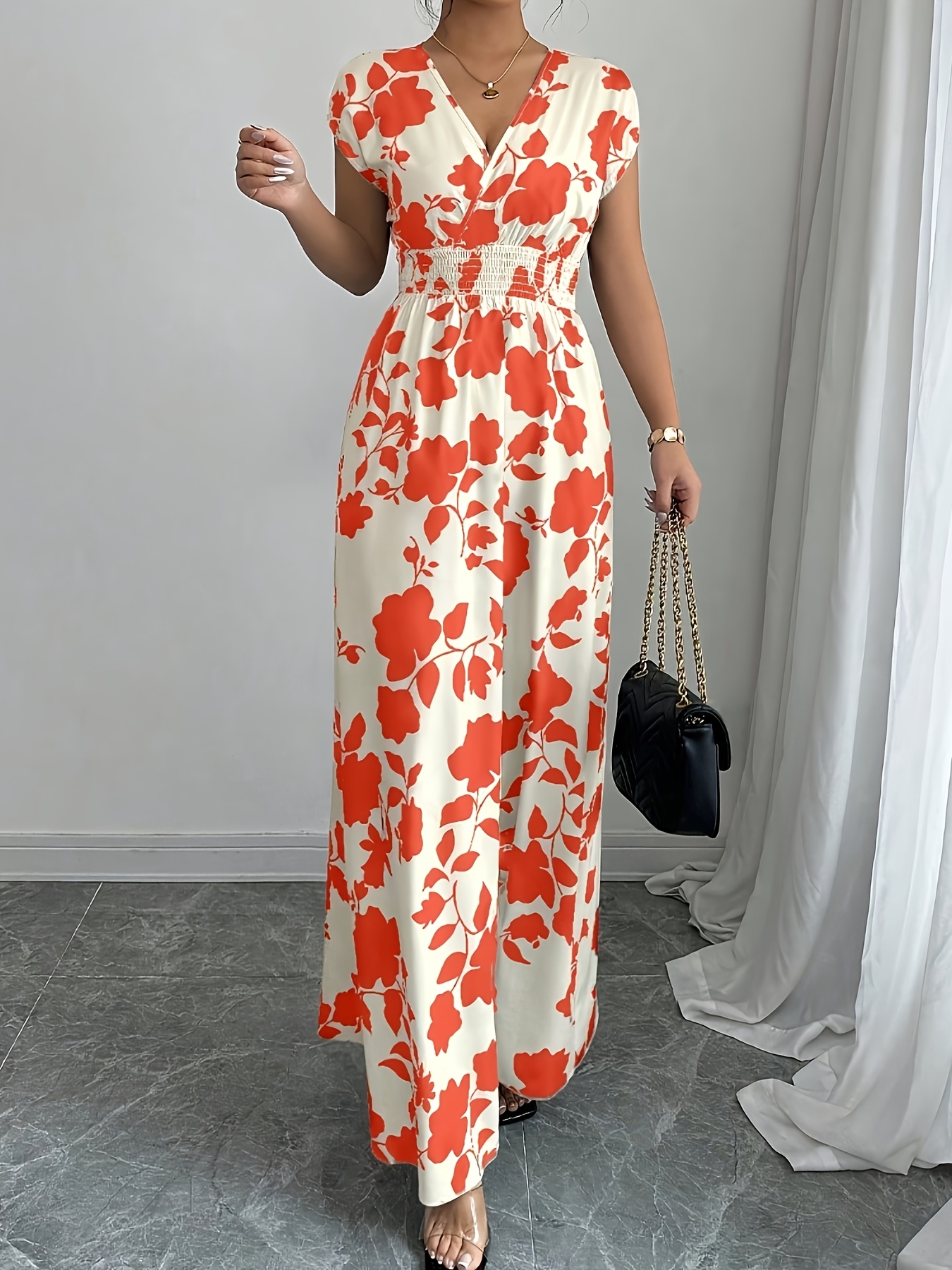 Elegant Pink Floral Maxi Dress with V-Neck and Short Sleeves - Flowing A-Line Silhouette, Cinched Waist, Perfect for Spring/Fall, Casual to Formal Wear, Casual Elegant Wear | Floral Print Dress | Cinched Waist Design
