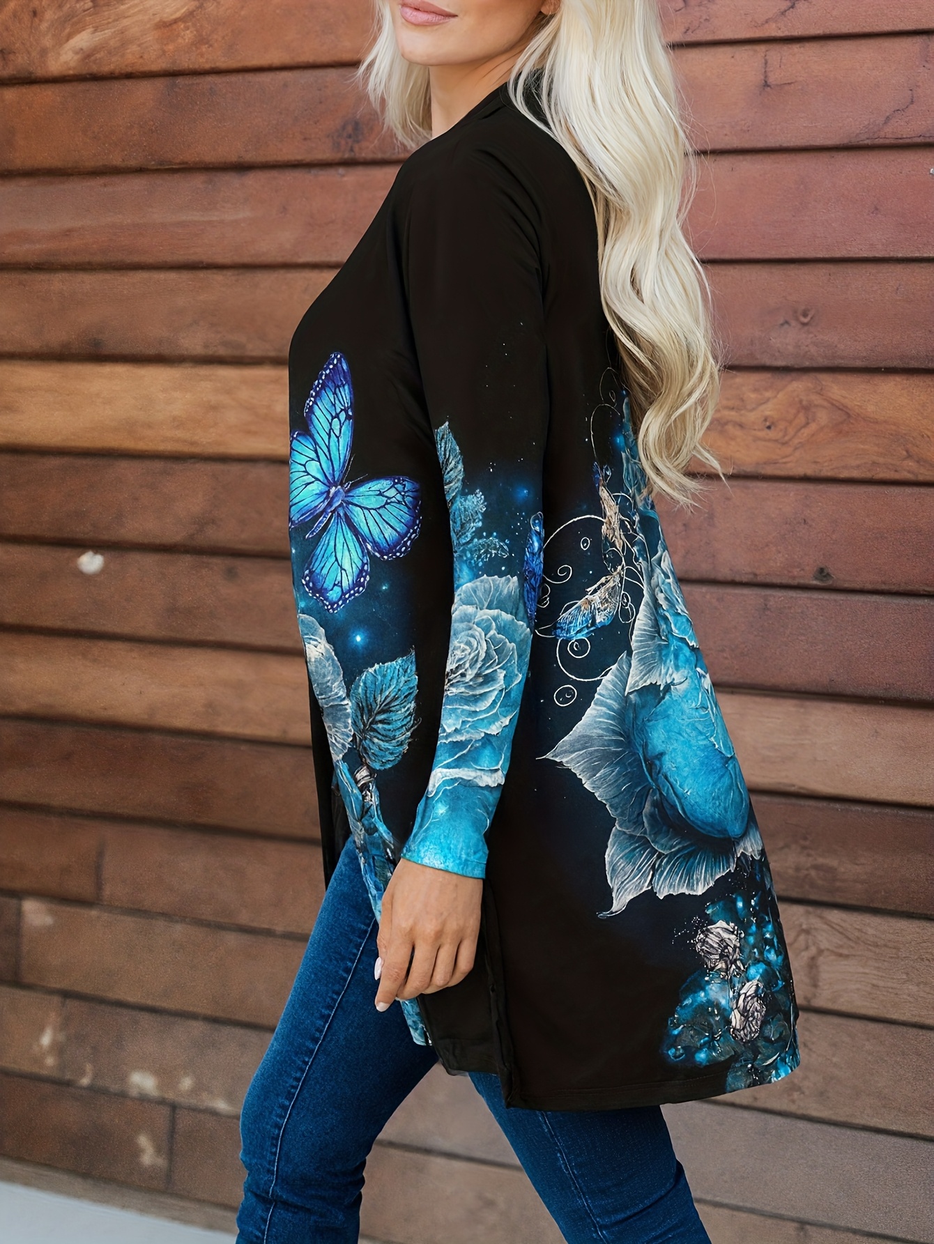 Plus Size, Women's Plus Size Elegant Cardigan Jacket - Flower & Butterfly Print Blouse, Machine Washable Winter Warm Long Sleeve Sweater Top, Casual Daily Outerwear for Layering (No Buttons/Collar)