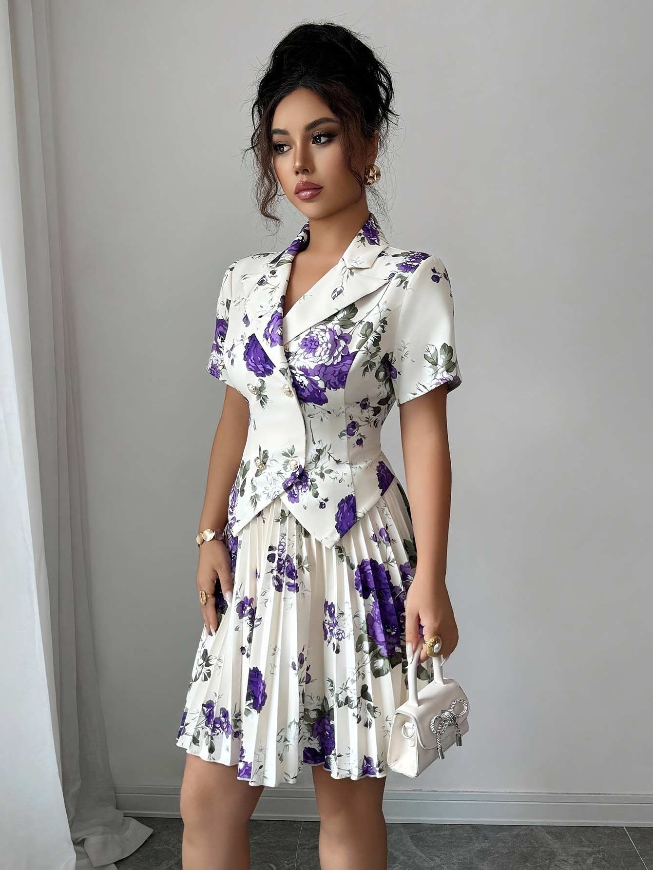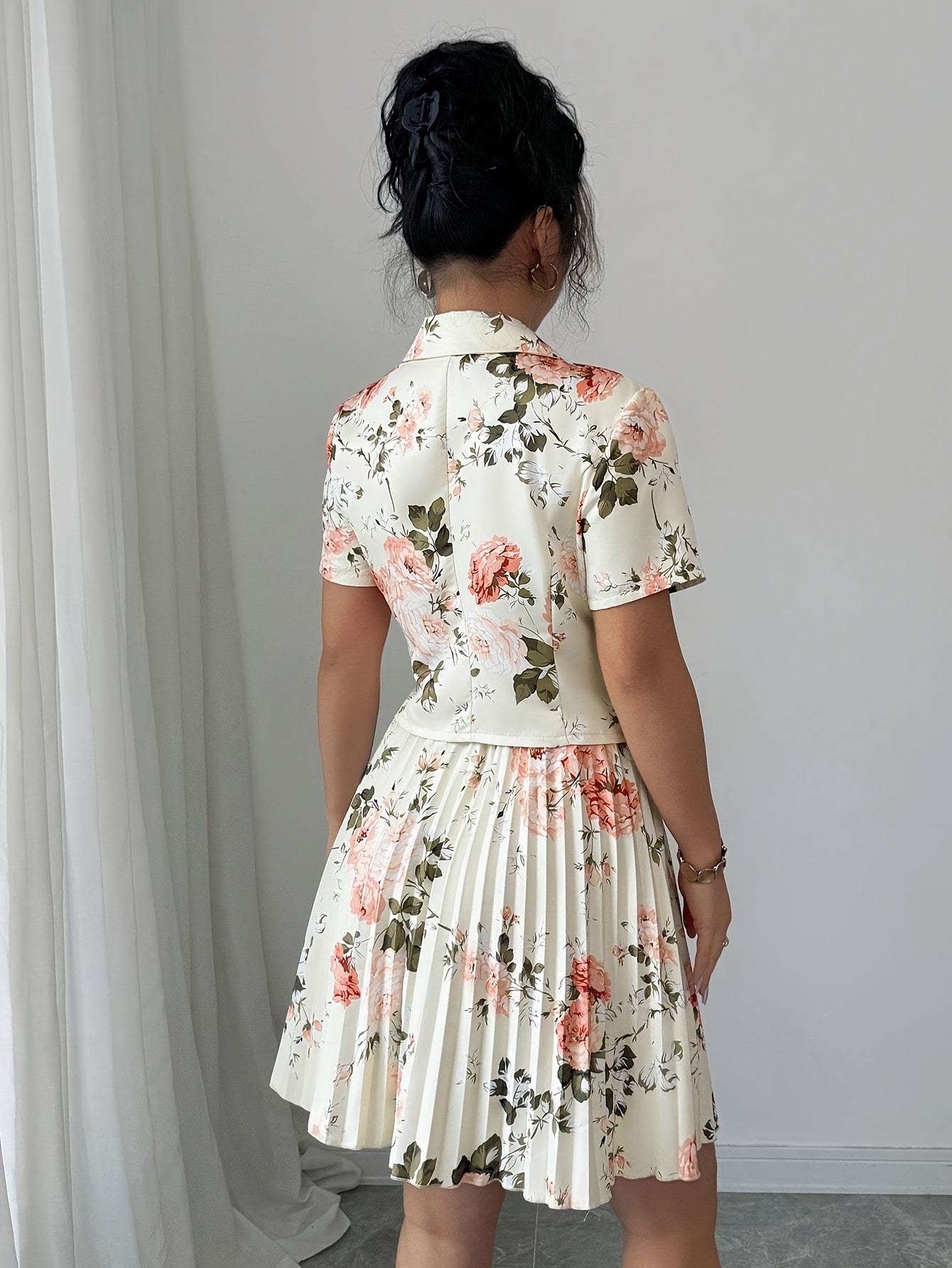 Printed Short Sleeve Pleated A-Line Elegant Romantic Women Suit Set