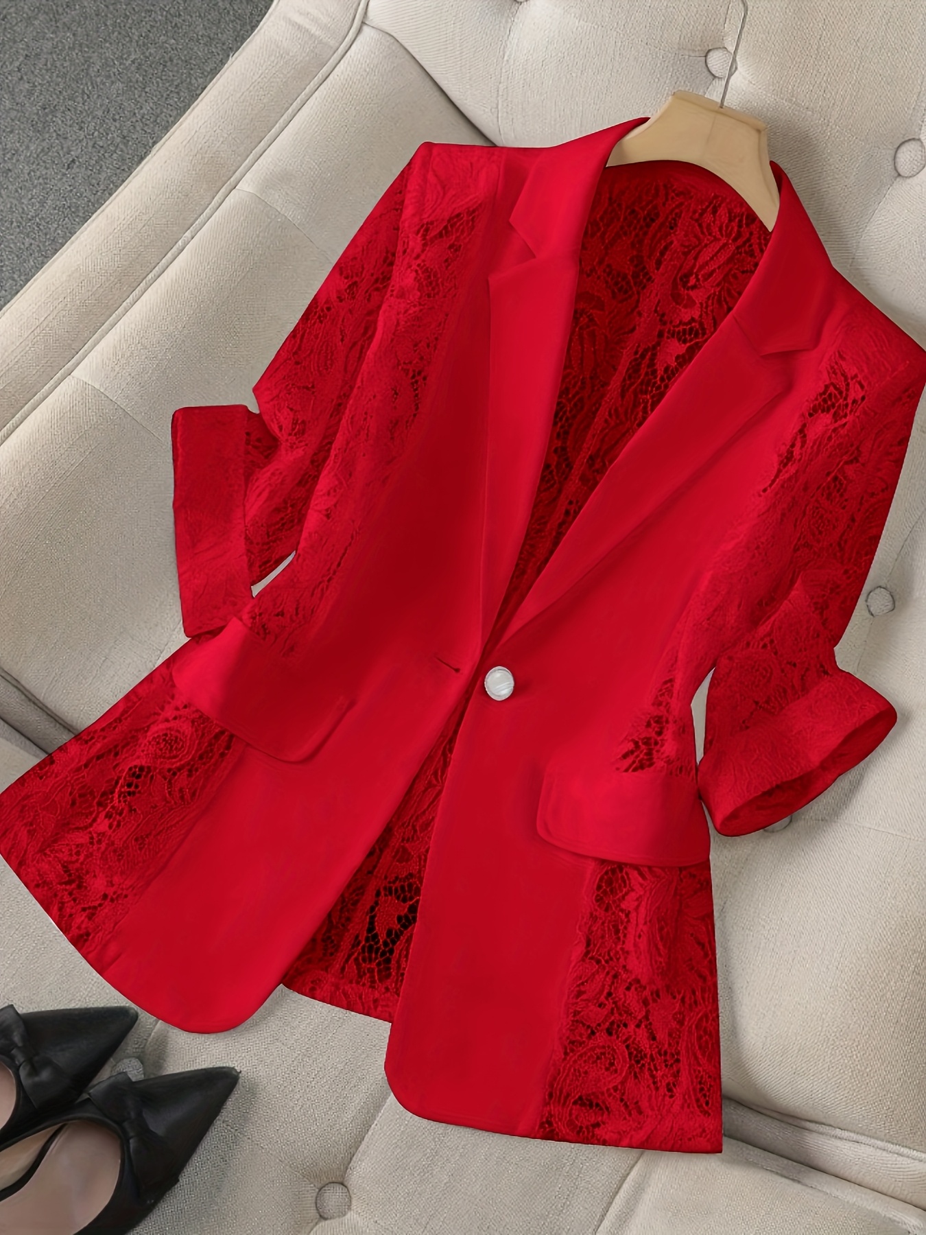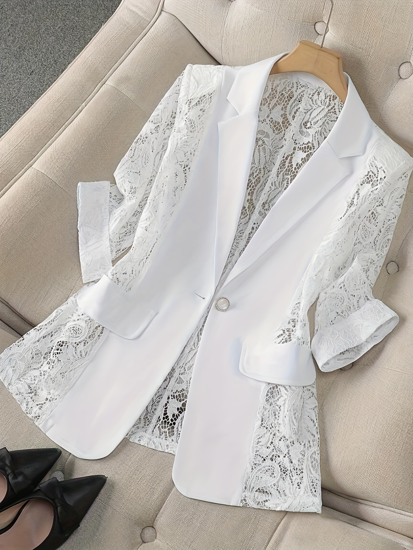 Women'S Lightweight Blazer - Elegant H-Silhouette Office Jacket, Non-Stretch Fabric, Three-Quarter Sleeve Blazer for Women, Professional & Casual Outfits (Spring/Fall/Summer) - Easy-Care Business Coat, Spring Summer Wear, Lace Trim Detailing, Fall Wardrobe, Breathable Material, Working Women