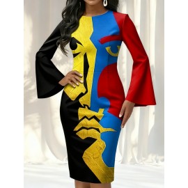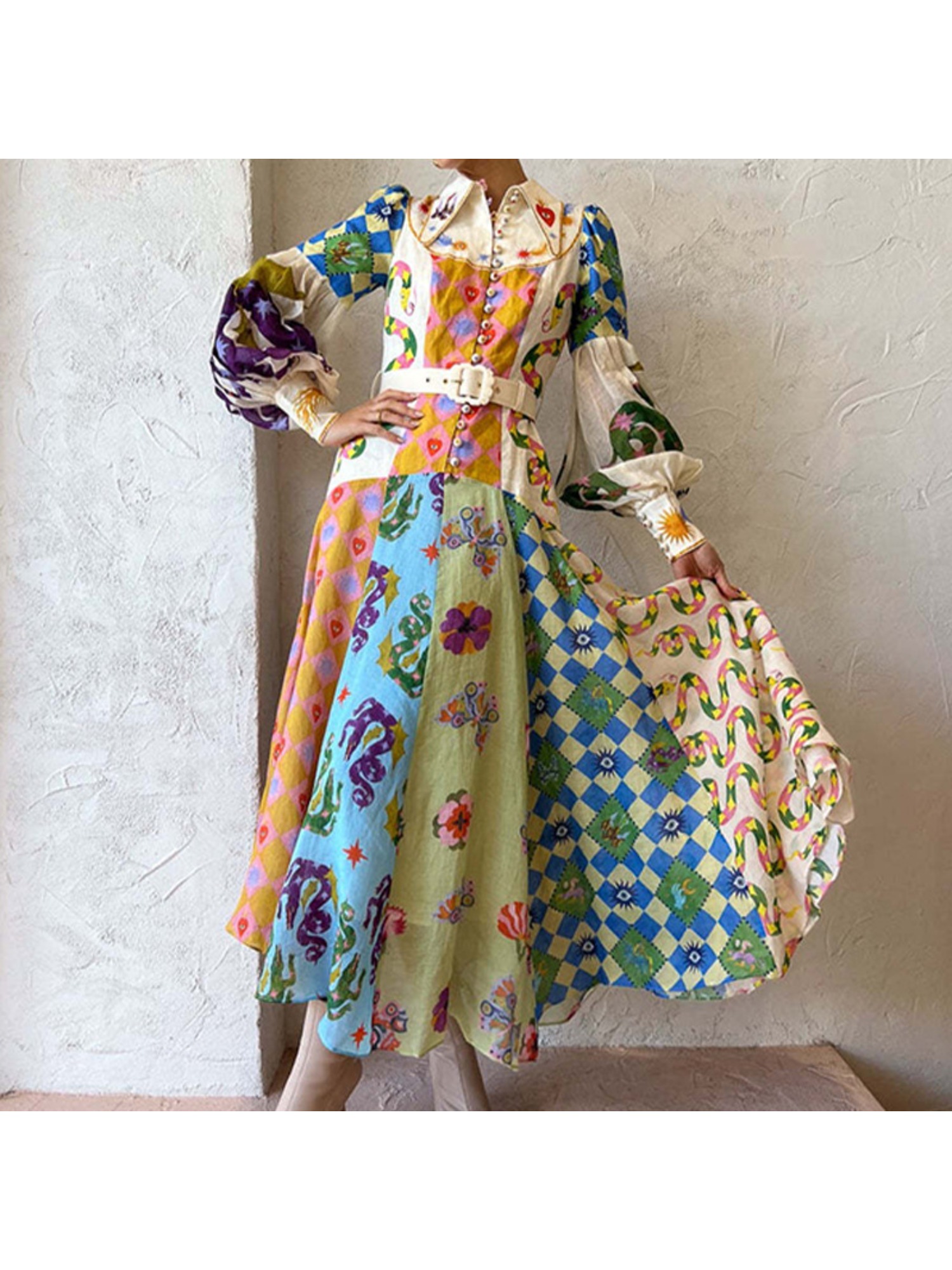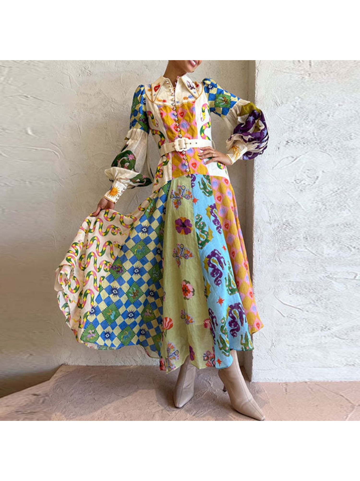 Women'S Retro Patchwork Print Maxi Dress | Belted Long Sleeve Gown for Artistic & Bohemian Chic Style, Geometric-Pattern, Fall/Winter Season, Off the Shoulder Collar, Regular Fit, Flared Hem